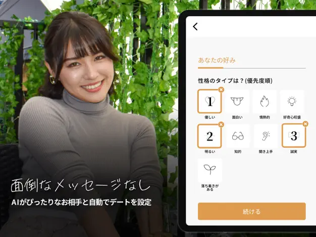 AIが好みの人と自動マッチング。いいねややりとりは一切不要で週1回デート保証!真剣な出会いを求める方のための婚活・恋活アプリです。